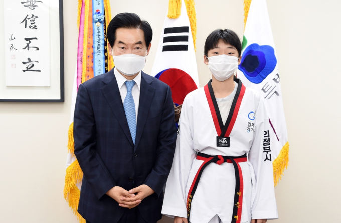[의정부=쿠키뉴스 윤형기 기자] 안병용 의정부시장은 16일 꿈나무 태권도 국가대표로 선발된 의정부 회룡초등학교 6학년 이은미 선수를 만나 격려했다.