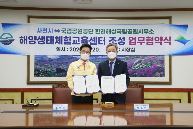 [사천=쿠키뉴스] 강연만 기자 = 경남 사천시(시장 송도근)가 지난 20일 국립공원공단 한려해상국립공원사무소와 해양생태체험교육센터 조성을 위한 업무 협약을 체결했다.
