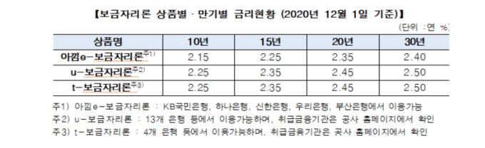 이번 금리 인상으로 ‘u-보금자리론’과 ‘t-보금자리론’은 대출만기에 따라 연 2.25%(만기 10년)∼2.50%(30년)로 이용할 수 있다. 온라인으로 신청하는 ‘아낌e-보금자리론’은 이보다 0.10%p 낮은 연 2.15%(10년)∼2.40%(30년)의 금리가 적용된다.