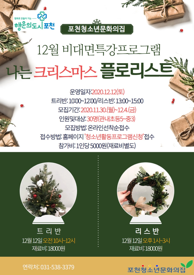 포천청소년문화의집은 다음달 12일 줌으로 비대면 크리스마스특강 '나는 크리스마스 플로리스트'를 진행한다고 30일 밝혔다.