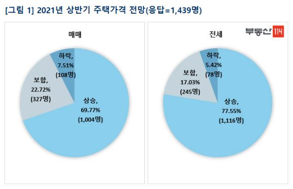 [쿠키뉴스] 조계원 기자 =내년 상반기 집값과 관련해 10명 중 7명은 집값이 더 상승할 것으로 내다봤다. 전셋값도 10명중 8명이 상승을 점쳤다. 부동산114가 2020년 11월 9일부터 23일까지 15일간 전국 1439명을 대상으로 ‘2021년 상반기 주택 시장 전망’ 설문조사를 실시한 결과 이같은 전망이 나왔다.