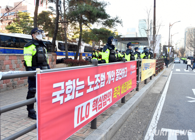 [쿠키뉴스] 박효상 기자 = 민주노총이 대규모 집회를 예고한 4일 서울 여의도 국회 앞 여의대로 일대에서 경찰이 만일의 사태에 대비하고 있다.