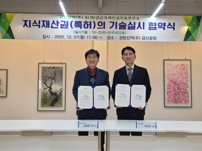 [대전=쿠키뉴스] 명정삼 기자 = (재)금산국제인삼약초연구소는 7일, 연구소가 보유 중인 팽화흑삼 및 이의 제조방법과 관련된 지식재산권(실시기술:10-2020-0151522호)을 경방신약(주)에 기술이전하고 사업화를 위한 전수 및 기술협력을 약속하는 협약을 체결했다.