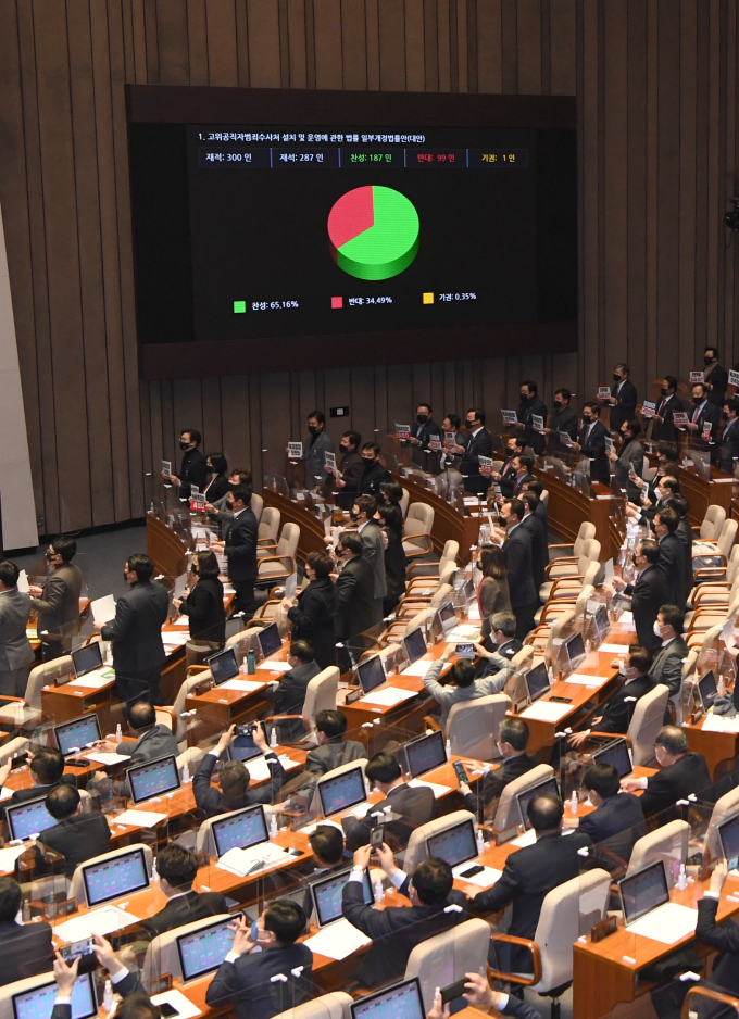 [쿠키뉴스] 박효상 기자 = 10일 서울 여의도 국회에서 열린 본회의에서 고위공직자범죄수사처 설치 및 운영에 관한 일부개정법률안이 통과됐다. 국민의힘 의원들이 공수처법 표결을 시작하자 자리에서 일어나 피켓을 들고 구호를 외치고 있다.