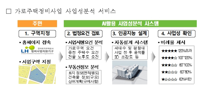LH의 설명에 따르면 ‘가로주택 사업성분석 서비스’는 주민이 직접 온라인 지도에서 사업시행구역을 지정하면 AI시스템이 해당 구역의 법정요건, 건축설계, 사업성 등을 자동으로 분석해 제공하는 서비스이다.