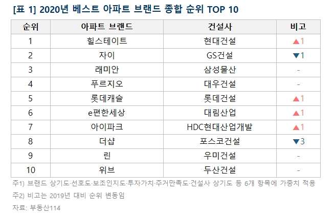 지난해와 비교하면 롯데건설 ‘롯데캐슬’이 1단계 상승해 톱5 상위권에 진입했으며, 중견건설사인 우미건설 ‘린’은 올해도 유일하게 10위권 안에 이름을 올렸다.