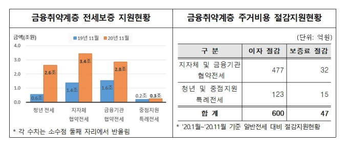 공사 관계자는 “올해 코로나19로 어려움을 겪는 서민층의 주거비 절감을 지원하기 위해 지자체 및 금융기관과 협업으로 9조 2000억원의 전세보증을 지원해 연간 600억원의 이자부담을 완화하고, 47억원의 보증료를 우대하는 등 647억원의 비용부담을 완화했다“면서 “앞으로도 금융취약계층에 대한 신상품 개발을 통해 서민 위주로 전세보증을 지원하겠다“고 말했다.