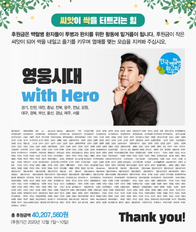 이번 백혈병환우회 기부 역시 연말을 맞아 지역 사회에 선한 영향력을 전파하고자 회원들이 자발적으로 참여한 이벤트였다. 팬클럽 ‘영웅시대 with Hero’는 그동안 후원을 지역별로 별도로 진행하다가 이번에는 전국이 하나 되자는 의미로 경기, 인천, 대전, 충남, 전북, 광주, 전남, 강원, 대구, 경북, 부산, 울산, 경남, 제주, 서울 등 전국의 회원들이 이번 모금에 참여했다.