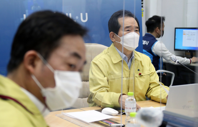 병상 확보에 대해서도 언급했다. 정 총리는 “비상 상황이 계속되는 수도권 지자체는 확진자가 병상 배정을 기다리며 하루 이상 대기하는 일이 없도록 행정력을 총동원하라”며 “전체 병상의 10%에도 미치지 못하는 공공병원만으로는 한계가 있다. 전국 종합병원 여러 곳이 거점 전담병원 지정을 요청해 감사하다”고 밝혔다.