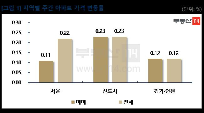18일 민간 부동산정보업체 부동산114에 따르면 서울 아파트 매매가격은 0.11% 올라 지난 주(0.10%)에 비해 상승폭이 확대됐다. 재건축과 일반 아파트가 각각 0.07%, 0.12% 상승했다. 이밖에 경기ㆍ인천이 0.12%, 신도시가 0.23% 올랐다.
