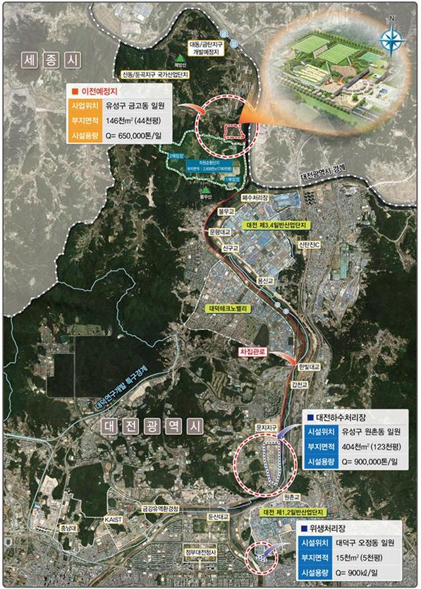 이 사업은 원촌동 일대 하수처리장과 오정동 분뇨처리장을 금고동 자원순환단지 인근으로 통합 이전하는 사업으로, 하수처리시설을 지하화해서 악취 발생을 원천적으로 차단하고 지상에는 체육시설 등 각종 주민 편익시설을 설치할 예정이다.