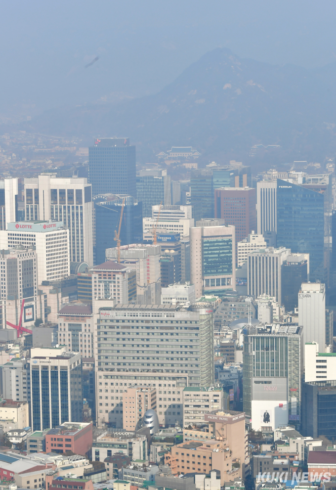 [쿠키뉴스] 박효상 기자 = 전국 대부분 지방에 초미세먼지농도가 나쁨을 기록한 24일 오전 서울 남산에서 바라본 도심이 뿌옇다.