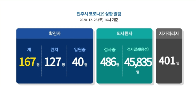 26일 오후 4시 기준 진주시 누적 확진자는 167명, 완치 127명, 입원 40명, 자가격리 401명이다.