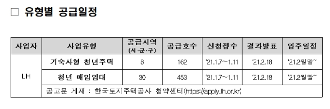 신청은 2021년 1월 7일부터 11일까지 온라인 청약센터 또는 모바일 앱(LH 청약센터)을 통해 가능하며, 자격심사 등을 거쳐 내년 2월 18일 예비자를 발표하고 2월 중 계약 및 입주가 시작될 예정이다.