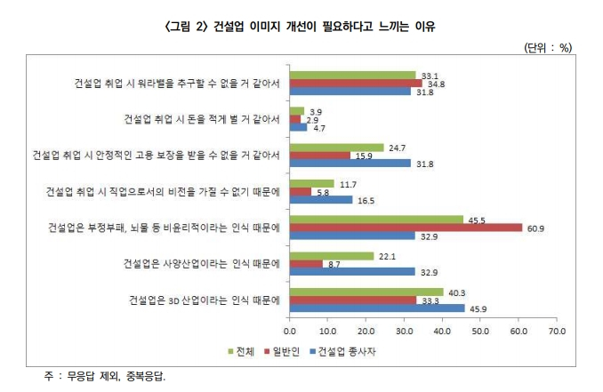 구체적으로 건설업의 이미지 개선이 필요하다고 느끼는 이유가 무엇이냐는 질문에 ‘부정부패, 뇌물 등 비윤리적이라는 인식 때문’이라는 응답이 1순위, ‘3D산업이라는 인식 때문에’가 2순위, ‘취업 시 워라밸을 추구할 수 없을 거 같아서’가 3순위로 꼽혔다.