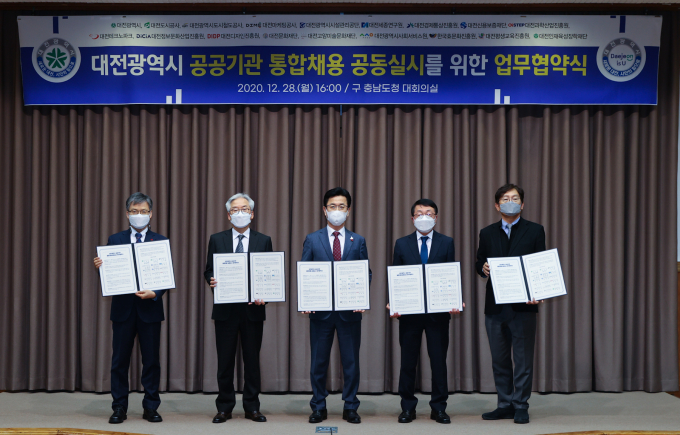 [대전=쿠키뉴스] 명정삼 기자 = 대전시(시장 허태정)는 28일 옛 충남도청 대회의실에서 대전시와 지방공공기관 통합채용 공동실시를 위한 업무협약을 체결했다고 발표했다.