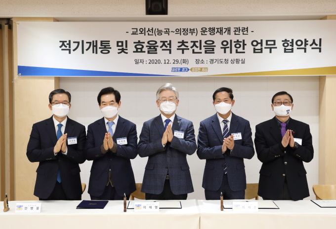 이재명 경기도지사는 29일 도청 상황실에서 이재준 고양시장, 안병용 의정부시장, 조학수 양주부시장과 이 같은 내용의 '교외선 운행재개 적기개통 및 효율적 추진을 위한 업무협약'을 체결했다.