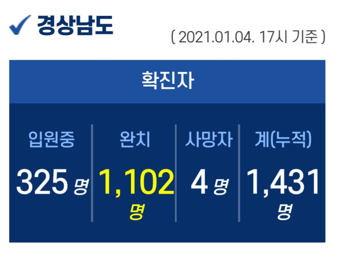 4일 오후 5시 기준, 경남의 코로나19 누적 확진자는 1431명, 입원 325명, 퇴원 1102명, 사망자 4명이다.