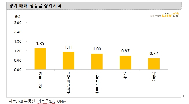 반대로 전국에서 매매가격 상승률이 가장 낮은 지역은 안성시(0.00%)로 가격 변동이 없었다. 이어 하남시(0.01%), 구리시(0.04%), 이천시(0.06%) 순으로 상승률이 낮았다.
