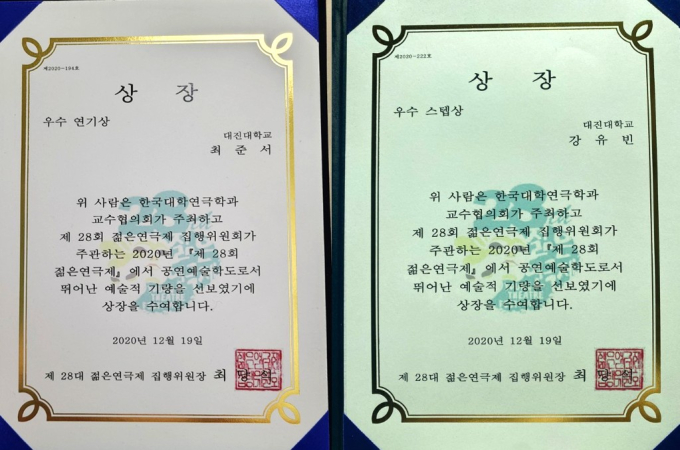 [포천=쿠키뉴스 윤형기 기자] 경기도 포천의 대진대학교는 국내 최대의 공연예술 페스티벌인 '제28회 젊은연극제'에서 연극영화학부 연극전공 최준서(16학번) 학생이 연기상을, 강유빈(18학번) 학생이 스탭상을 각각 수상했다고 11일 밝혔다.