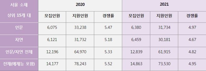 서울 소재 상위 15개 대학 정시 모집 인원은 2020학년도 대비 686명이 증가한 1만2863명이었으나, 전체 지원자는 4713명이 감소한 7만3530명이었다.결국 학령 인구의 감소로 인한 여파가 정시 지원에도 적용된 것을 알 수 있다.