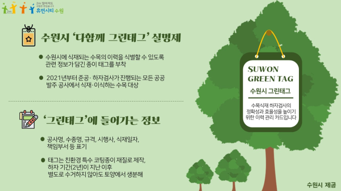 수원시는 2021년부터 준공 및 하자검사가 진행되는 모든 공공발주 공사에서 식재 또는 이식하는 수목에 '다함께 그린태그'를 부착하는 방식으로 실명제를 도입한다.