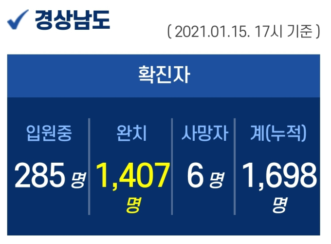 15일 오후 5시 기준, 경남도내 입원 중인 확진자는 285명이고, 퇴원 1407명, 사망 6명, 누적 확진자는 총 1698명이다.