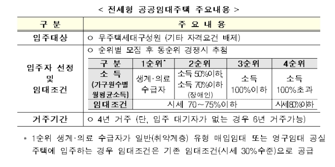 설명에 따르면 이번에 공급하는 전세형 주택은 기존 건설‧매입임대주택의 입주자격을 대폭 완화해 소득‧자산에 관계없이 무주택 세대 구성원이면 누구나 신청할 수 있는 것이 특징이다.