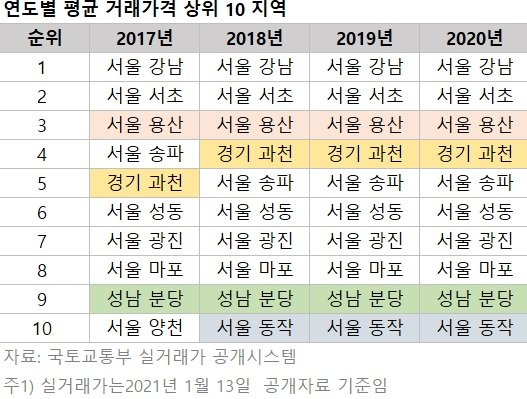 아파트 시장을 리드하던 '강남 3구(강남·서초·송파)'에서 송파 대신 용산이 3위에 이름을 올렸다. 시장에선 한남더힐 분양전환이 영향을 미쳤다는 분석이다. 나인원한남이 올해 분양전환을 앞두고 있어 올해는 강남·서초의 순위를 위협할 가능성도 제기됐다.
