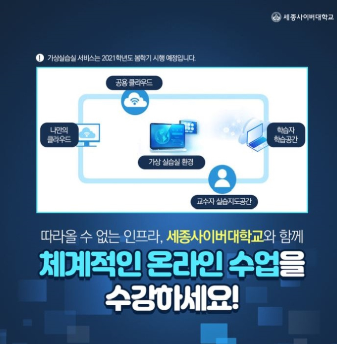 세종사이버대학교 IT학부장 유혜정 교수는 “IT학부의 각 학과 내 주요 실습수업을 클라우드 기반 가상실습실을 통해 진행할 계획”이라며 “다양한 IT 환경에서 이루어지는 서로 다른 수업 및 실습환경을 가지고 있는 학생들에게 쾌적하고 효율적인 학습 환경을 제공하고, 코딩 실습을 시작으로 인공지능과 같이 높은 성능의 PC가 요구되는 수업에도 원활하게 운영할 수 있을 것으로 기대한다”라고 설명했다.