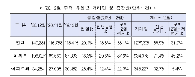 19일 국토교통부에 따르면 지난해 1월부터 12월까지 주택 매매 거래량은 127만 9305건으로, 2019년 매매량 보다 58.9% 증가했다. 이는 정부가 주택 거래량 통계를 작성한 2006년 이후 가장 많은 수치이다.