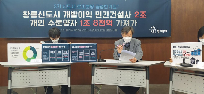 참여연대는 21일 오전 11시 기자회견을 열어 3기 신도시 대상지 중 하나인 고양 창릉지구 전체 3만 8천호 중 1만5천호(40%)를 택지 매각을 통해 분양할 경우, 민간건설사와 개인 수분양자가 이른바 ‘로또분양’으로 얻는 개발이익이 최소 2조4000억원에서 최대 3조8000억원으로 추정된다는 분석 결과를 발표했다.