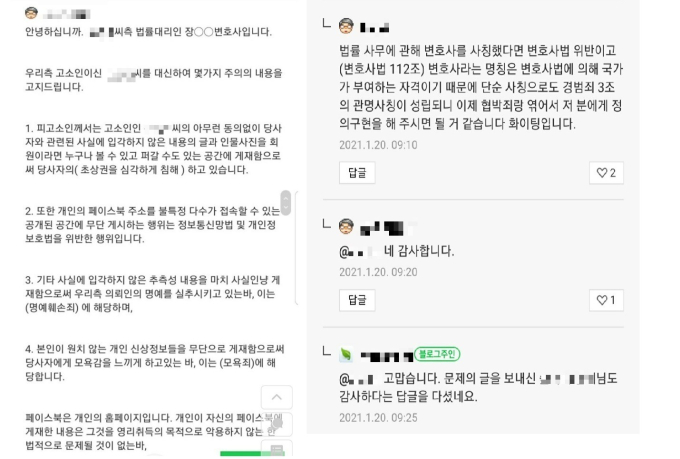 바로 다음날 “손씨 측 법률대리인 장○○ 변호사입니다”라고 본인을 소개하는 네티즌 B씨가 댓글을 달았다. B씨는 “피고소인에 대해서 초상권 침해, 허위사실 유포, 명예훼손, 정보통신망법 및 개인정보보호법 위반, 모욕죄 등 혐의로 법적대응하겠다”고 알렸다. 또 손씨를 비판한 글을 삭제하고 해명할 내용이 있다면 알려 달라며 자신의 이메일 주소를 함께 남겼다.