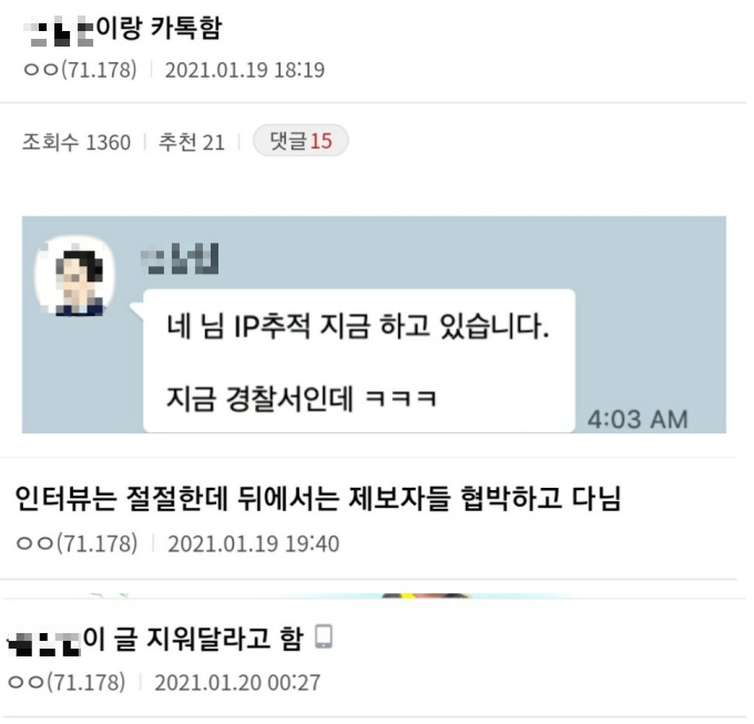A씨뿐만 아니다. 온라인 커뮤니티에서는 “손씨로 추정되는 사람으로부터 IP를 추적해 신상을 알아냈다는 협박을 받았다” “손씨가 (자신과 관련된) 글을 지워달라고 했다”는 복수의 주장이 잇따라 올라온 상태다.그런데 정작 당사자인 손씨는 변호사를 선임한 적도 없고 법적 대응에도 나설 계획이 없다는 입장이다. 손씨는 20일 쿠키뉴스에 “변호사를 선임하지 않았다. 지금은 잘못을 뉘우칠 때라고 생각한다”고 했다.