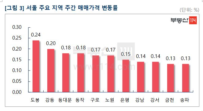 도봉은 창동 쌍용, 주공4단지, 상계주공18단지와 도봉동 동아에코빌 등이 500만원-2,000만원 상승했다. 강동은 재건축 단지인 둔촌동 둔촌주공, 명일동 삼익그린2차와 함께 고덕동 고덕그라시움, 고덕래미안힐스테이트 등 대단지가 500만원-2,500만원 올랐다. 동대문은 전농동 래미안아름숲, 답십리동 힐스테이트청계가 2,000만원-3,000만원 상승했다. 동작은 흑석동 롯데캐슬에듀포레와 상도동 상도중앙하이츠빌, 힐스테이트상도프레스티지 등이 1,000만원-4,000만원 올랐다. 구로는 천왕동 천왕연지타운2단지, 신도림동 대림2차 등 대단지에서 중대형 면적 위주로 500만원-5,500만원 상승했다. 강남은 압구정동 신현대, 대치동 한보미도맨션1,2차와 선경1,2차 등 재건축 단지가 2,500만원-7,500만원 올랐다.
