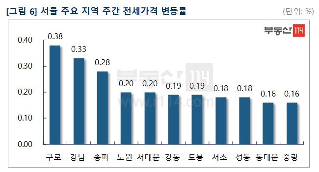 서울 전세시장은 수요가 줄면서 전체 25개 구 가운데 15개 구에서 전주대비 오름폭이 축소됐다. 지역별로는 ▲구로(0.38%) ▲강남(0.33%) ▲송파(0.28%) ▲노원(0.20%) ▲서대문(0.20%) ▲강동(0.19%) ▲도봉(0.19%) 순으로 올랐다.