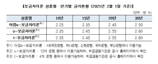 또한 전자약정 등 온라인으로 신청해 비용이 절감되는 ‘아낌e-보금자리론’은 연 2.25%(10년)∼2.50%(30년)의 금리가 적용된다.
