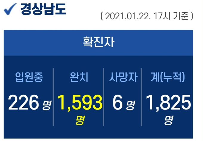 22일 오후 5시 기준, 경남도내 입원 중인 확진자는 226명이고, 퇴원 1593명, 사망 6명, 누적 확진자는 총 1825명이다.