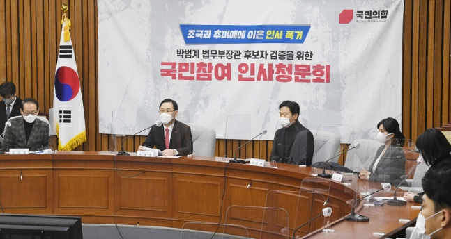 주호영 원내대표는 이 자리에서 "박 후보자는 공직자 재산신고 고의 누락, 로펌 변호사 선관위 추천, 교통법규 위반, 금품요구, 폭행, 갑질논란 등 일일이 열거하기도 힘들 지경"이라며 "박 후보자를 철저하게 검증하기 위해 증인 신청을 했지만 민주당은 한 사람도 추천을 안 하면서 철벽봉쇄로 무력 인사청문회를 하려 한다"고 비판했다.