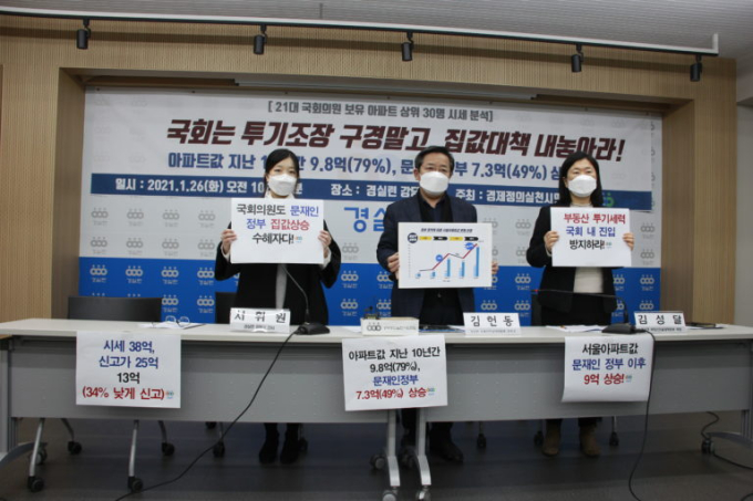 26일 경실련에 따르면 21대 국회의원 중 아파트 재산 상위 30명이 신고한 아파트 가격은 신고액 기준 총 750억원(1인당 25억원), 실거래가 기준 총 1131억원(1인당 37억원)으로 집계됐다. 신고액이 실거래가의 66.3%에 불과하며, 두 가격 사이에 381억원(1인당 12.7억)의 차이가 발생했다.
