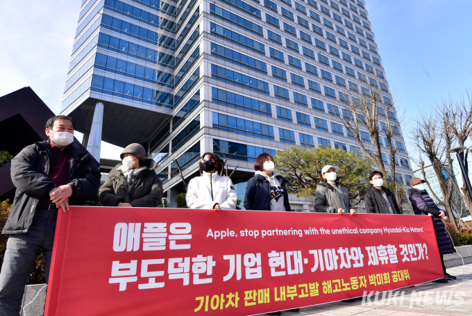 [쿠키뉴스] 박효상 기자 = 기아차내부고발자박미희공대위(이하 공대위)가 27일 오전 서울 영동대로 애플코리아 본사 앞에서 애플과 현대·기아차의 제휴를 반대하는 기자회견을 열었다. 공대위 관계자는 "현대차 그룹은 내부고발자를 부당하게 해고하고 8년째 문제 해결은커녕 모든 수단과 방법을 동원해서 탄압한다"라고 폭로했다. 이어 "세계적인 기업 애플이 현대차 그룹과 협업을 진행할 경우 애플의 이미지 추락이 걱정된다"라며 기자회견 취지를 밝혔다. tina@kukinews.com