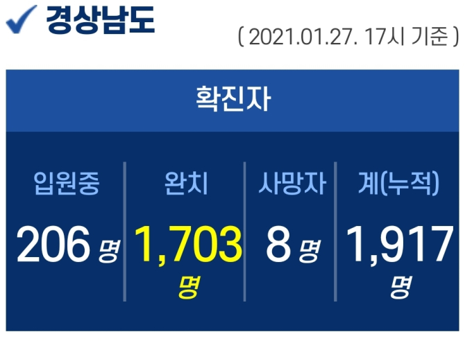 27일 오후 5시 기준, 경남도내 입원 중인 확진자는 206명이고, 퇴원 1703명, 사망 8명, 누적 확진자는 총 1917명이다.