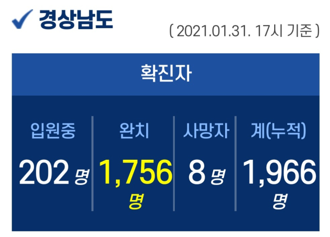 31일 오후 5시 기준, 경남도내 입원 중인 확진자는 202명이고, 퇴원 1756명, 사망 8명, 누적 확진자는 총 1966명이다.