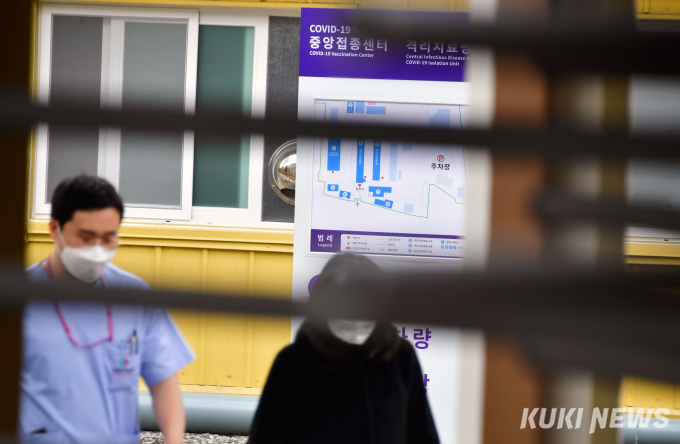 [쿠키뉴스] 박효상 기자 = 1일 서울 중구 국립중앙의료원 코로나19 격리치료병동 및 중앙접종센터에서 관계자가 이동하고 있다.