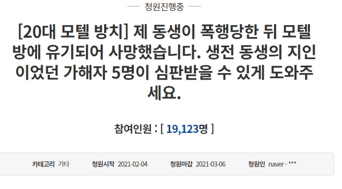 청와대 국민청원에는 지난 4일 '제 동생이 폭행당한 뒤 모텔 방에 유기돼 사망했습니다. 생전 동생의 지인이었던 가해자 5명이 심판받을 수 있게 도와주세요'란 제목의 글이 게재됐다.