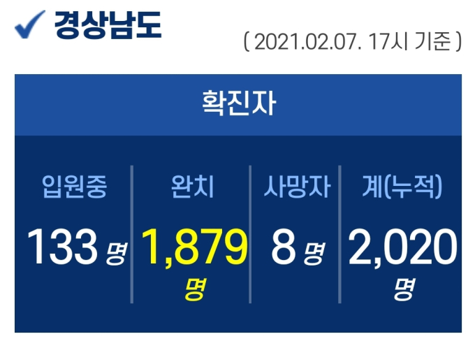 7일 오후 5시 기준, 경남도내 입원 중인 확진자는 133명이고, 퇴원 1879명, 사망 8명, 누적 확진자는 총 2020명이다.