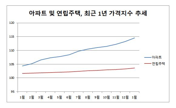 실제 한국부동산원의 통계를 보면 지난 1년간 아파트와 빌라의 가격 상승률 차이는 5배에 가까운 것으로 나타났다. 한국부동산원의 수도권 아파트 매매가격지수는 지난해 1월 104.4에서 올해 1월 114.53으로 9.7% 증가했다. 같은 기간 빌라의 매매가격지수는 2.0%(101.6→103.6) 증가하는데 그쳤다.