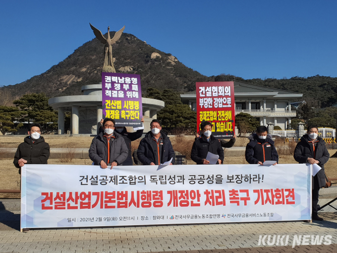 전국사무금융서비스노동조합은 9일 청와대 분수대 앞에서 건산법 시행령 개정안 처리 촉구를 위한 기자회견을 개최했다. 앞서 국토부는 박덕흠 의원 사태로 논란이된 공제조합의 의사결정과 운영방식을 혁신하기 위해 지난해 말 ‘건설산업기본법’ 시행령 개정안을 입법예고 했다.
