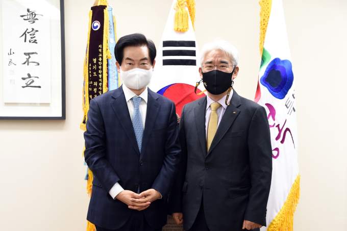 [의정부=쿠키뉴스 윤형기 기자] 안병용 의정부시장은 10일 집무실에서 KB손해보험 대표로 새로 취임한 김기환 KB스타즈 배구단 구단주와 환담했다.