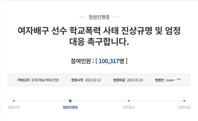 청와대 국민청원에는 지난 12일 ‘여자배구 선수 학교폭력 사태 진상규명 및 엄정대응 촉구합니다’라는 제목의 게시글이 게시됐다.